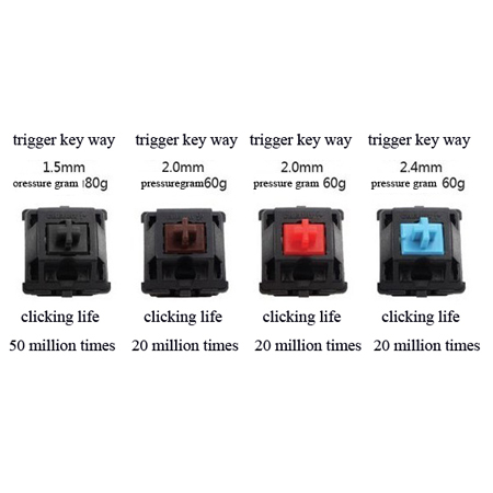 Green axis It has the strongest paragraph and mechanical sense. It is representative axis of the mechanical keyboard. The trigger key distance is 2.4MM. The typing rhythm is excellent and has large sound. The pressure grams is 60G ( office good ) .